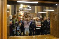 A crowd opposed to redistricting stood outside the Senate chamber on Monday, chanting slogans such as “no cheaters!” and “no redistricting!” The Senate met for less than 15 minutes, but the crowd stayed around the Statehouse for the Elections Committee meeting at 1:30 p.m. to continue voicing their opposition.