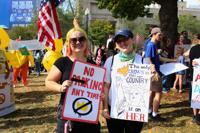 His husband, now deceased, used to accompany him. At the No Kings 2.0 protest, he brought a cooler filled with water bottles to offer to fellow protestors.