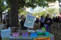 Kristen Kruger. In the middle of the crowd at the No Kings 2.0 protest was a foldable table laid out with homemade goods: puppy chow, popcorn, pumpkin muffins and hamantaschen—a triangular pastry filled with jam. Standing over the table, Kristen Kruger from McCordsville said she loved the strawberry jam hamantaschen. The other kinds were peach and blueberry, all with homemade jams.