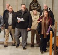Jodie English (far right) joined the interfaith coalition in delivering letters opposing the death penalty to Gov. Mike Braun’s office on Dec. 16. First Friends had appealed to then-Gov. Eric Holcomb in October of last year to cease capital punishment. The Quakers then filed an open records request for information about the drugs being used in the lethal injection and eventually sought a ruling from the Indiana public access counselor. Then, encouraged by Braun’s public comments that he was open to a discussion on the death penalty, First Friends and Shalom Zone, an interfaith group, arrived at his office on Dec. 16, with the letters and were able to elicit a promise for a meeting with the governor’s staff.