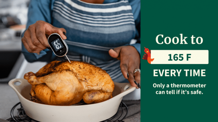 The turkey is golden brown, the kitchen smells amazing, and your guests may be telling you it’s ready to eat. But looks can be deceiving when it comes to cooking poultry. The only way to know if your turkey is both done AND safe is to use a food thermometer. Undercooked poultry can cause foodborne illness, and the thermometer takes out the guesswork.