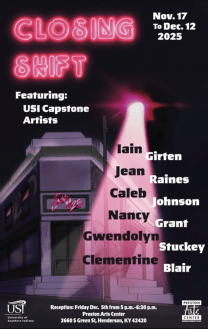 The Preston Arts Center, in Henderson, Kentucky, is hosting the group exhibition Closing Shift: USI Capstone Artists now through Friday, December 12. This exhibition features the creative work of six University of Southern Indiana artists majoring in studio art, photography, illustrations, graphic design, interactive media and art education.